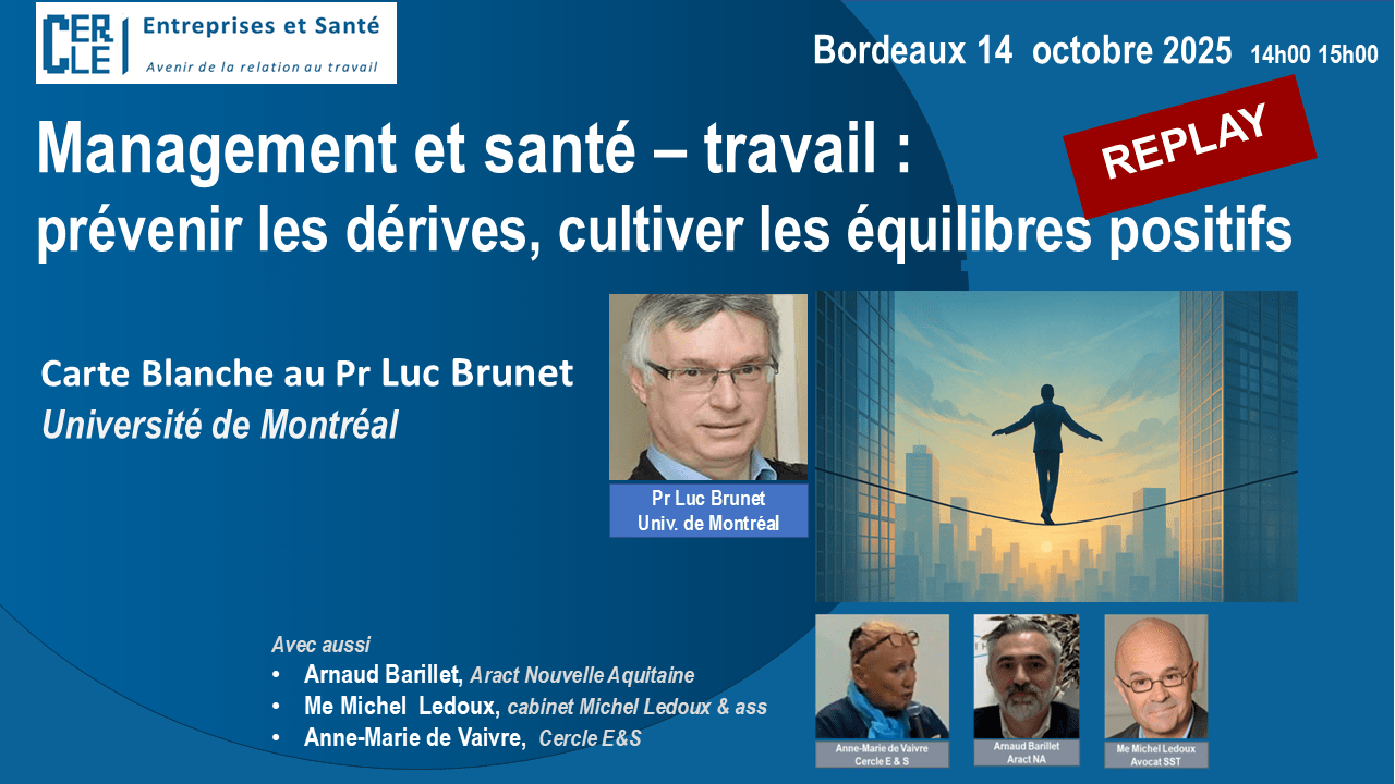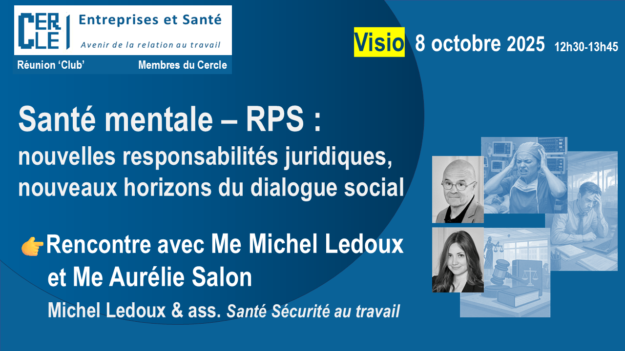 Le Cercle Entreprises et Santé, créé fin 2006, est un Think tank / Do-tank dédié aux voies d’avenir de la relation au travail, au fil de la Santé Globale, (Santé-Travail, Santé Globale, Santé Environnement), en responsabilité et contribution à la ‘Santé Bien Commun’.